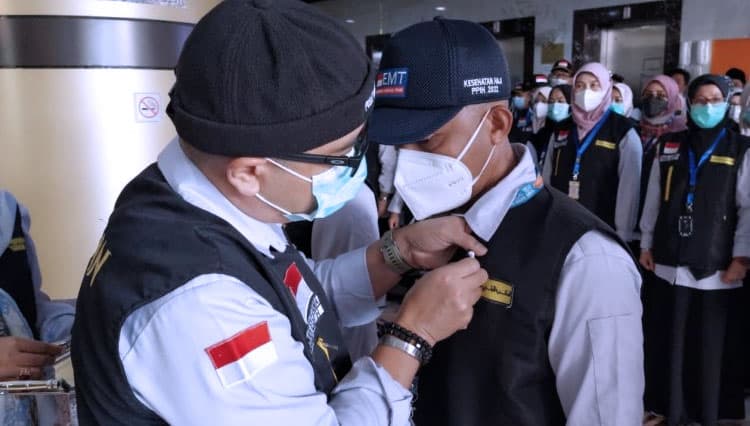 TIMES Brebes/Kapuskes Haji Kemenkes Budi Sylvana saat menyematkan pin kepada petugas kesehatan haji. (FOTO: dok. Kemenkes)