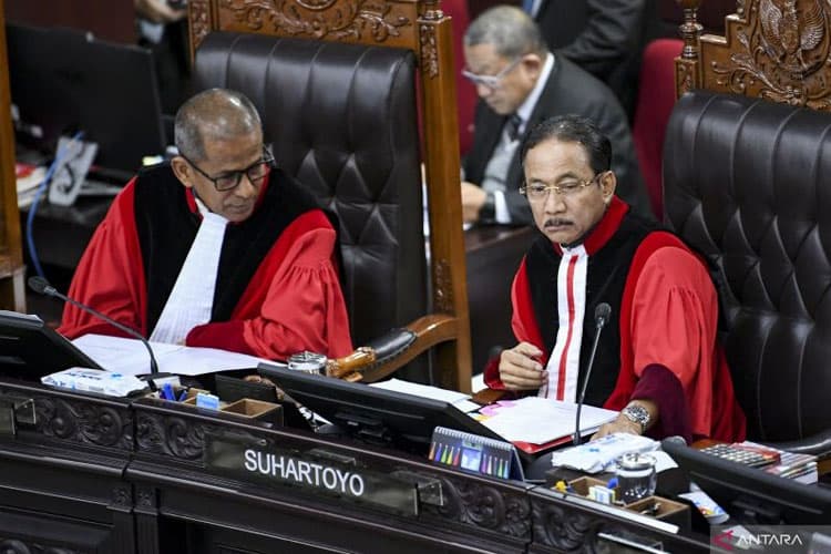 TIMES Brebes/Ketua Mahkamah Konstitusi (MK) Suhartoyo (kanan) bersama Wakil Ketua MK Saldi Isra memimpin sidang pengucapan putusan perkara dilanjutkan atau tidak (dismissal) sengketa Pilkada 2024 di Gedung Mahkamah Konstitusi, Jakarta, Rabu (5/2/2025). (ANTARA)