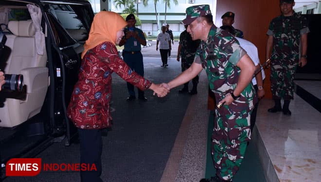 TIMES Brebes/Pangdam V/Brawijaya, Mayjen TNI Wisnoe, P.B, menyambut kedatangan Gubernur Jatim, Khofifah Indar Parawansa di Makodam V/Brawijaya, Rabu (20/2/2019).(Foto: Istimewa)
